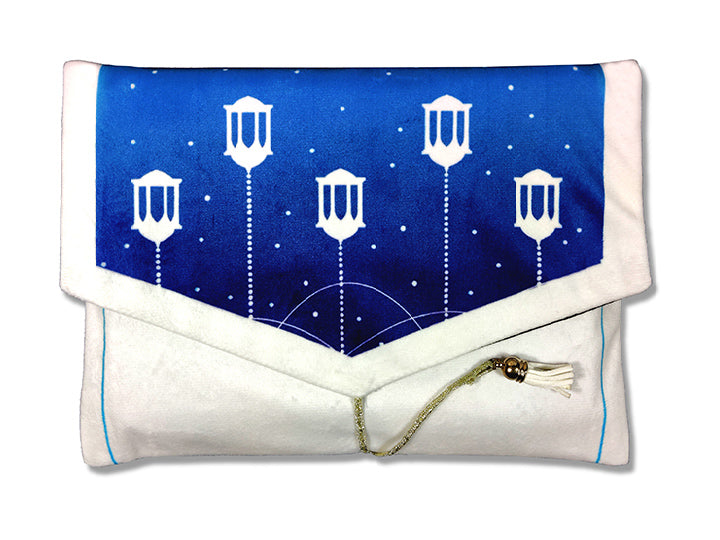 The premium quality suede velvet cover slides over the hardback cover of your Quran. A long ribbon that you can tie holds it shut when not in use.