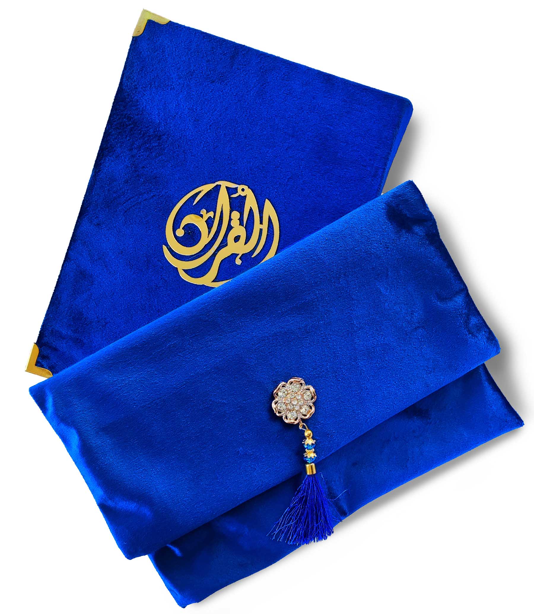 Velvet covered Quran in rainbow colored pages, comes with a matching velvet magnetic cover. Quran is adorned with a beautiful design reading القرآن and the cover has a luxurious finish to it with a jewelled tassel. This set can be paired perfectly with Art Beat Creations prayer mats, making it a perfect choice to gift your loved ones!