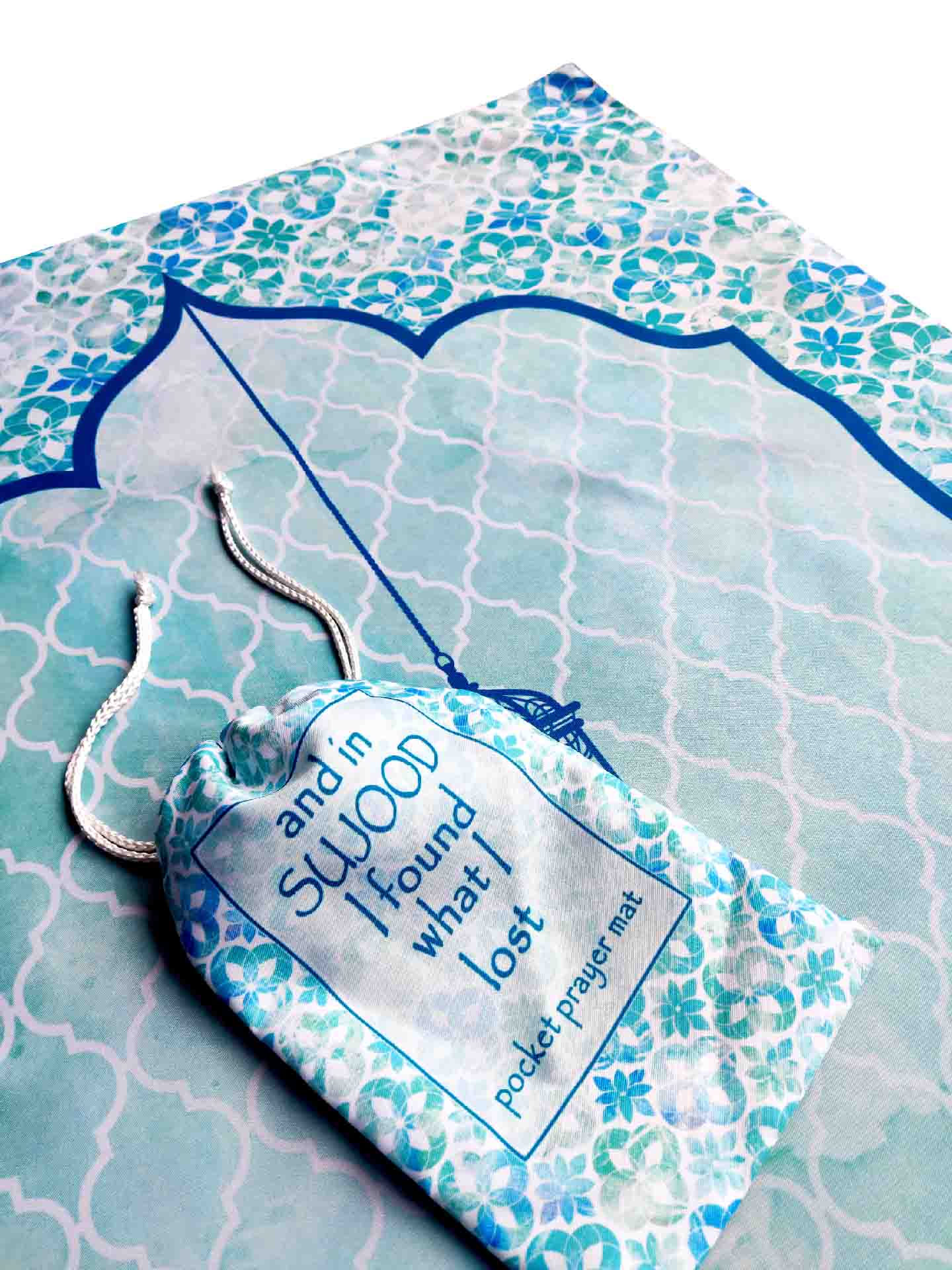 Pocket prayer mat - Your beautiful companion for prayer on the go! These are light weight, soft and foldable, designed to be carried anywhere and everywhere with you. Available in a gorgeous pattern digitally printed on twill fabric, it also comes in a coordinating drawstring pouch making it easy to carry or fit into any bag.