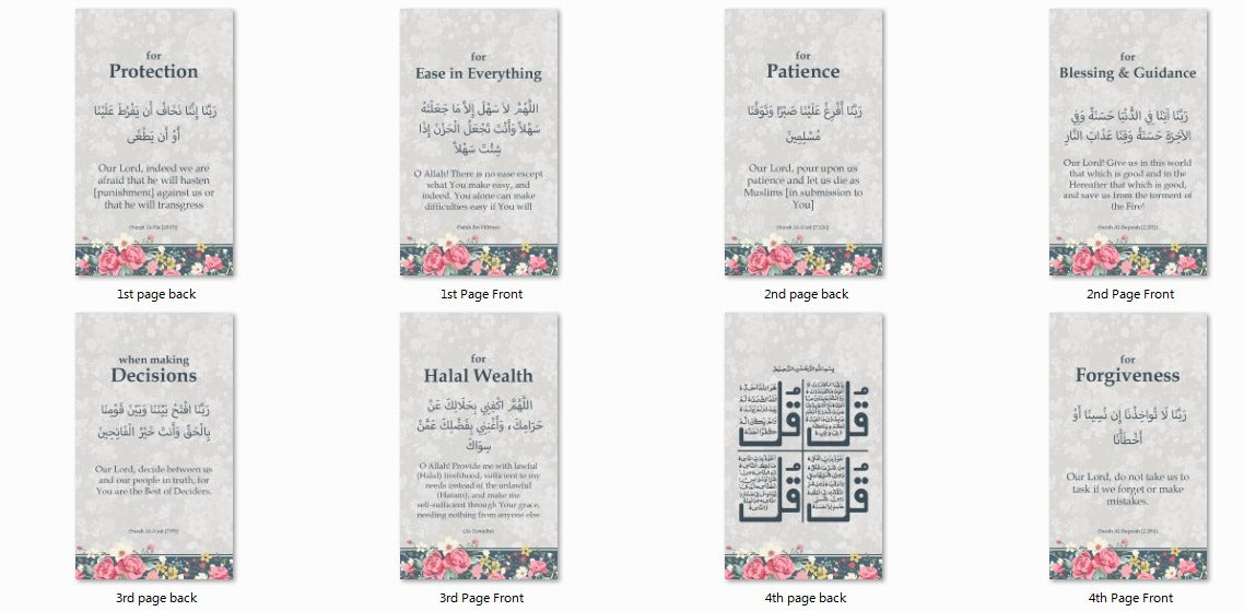 ✔️ Duas – Includes 8 essential everyday prayers (protection, forgiveness, patience, etc.)