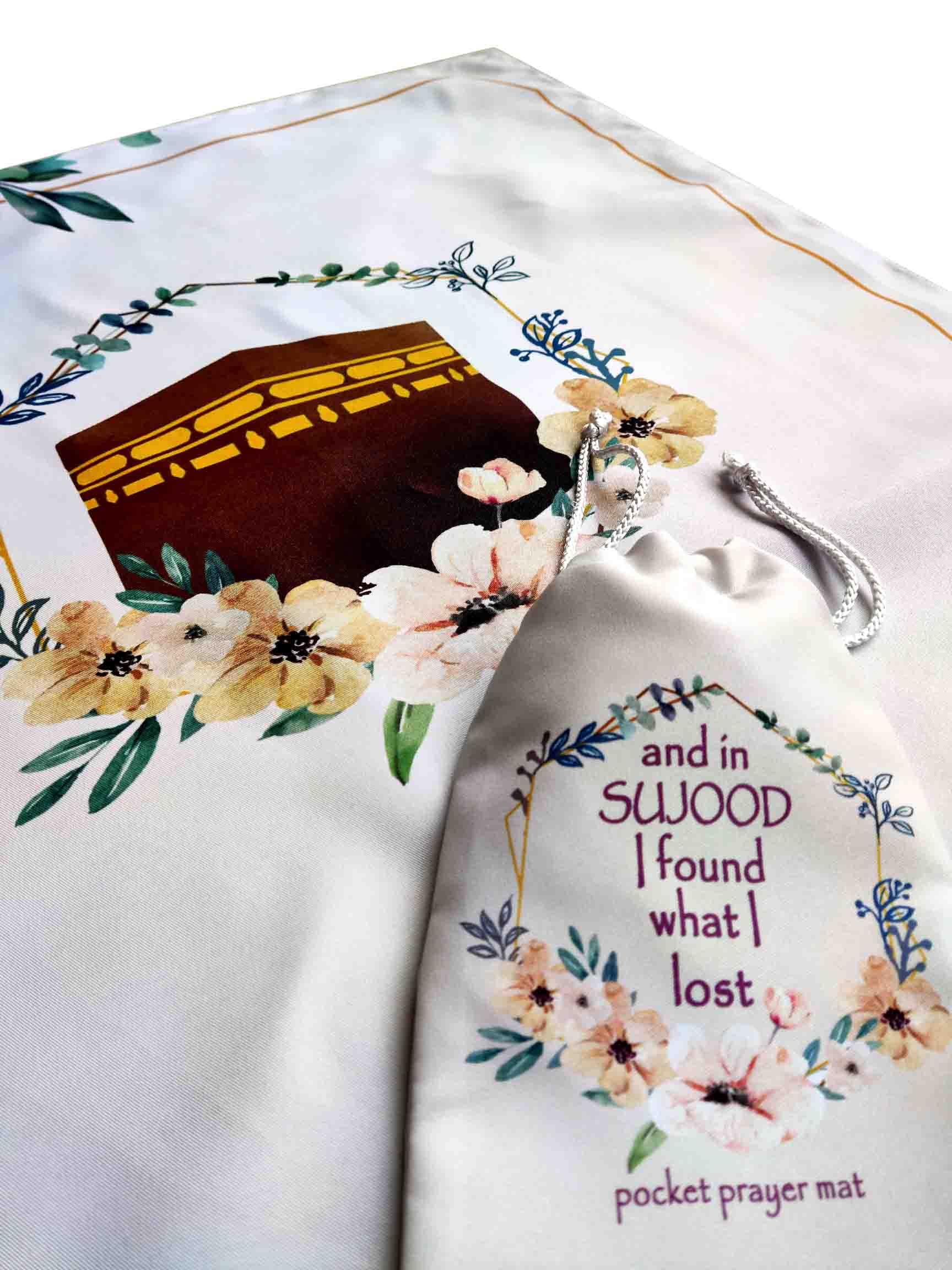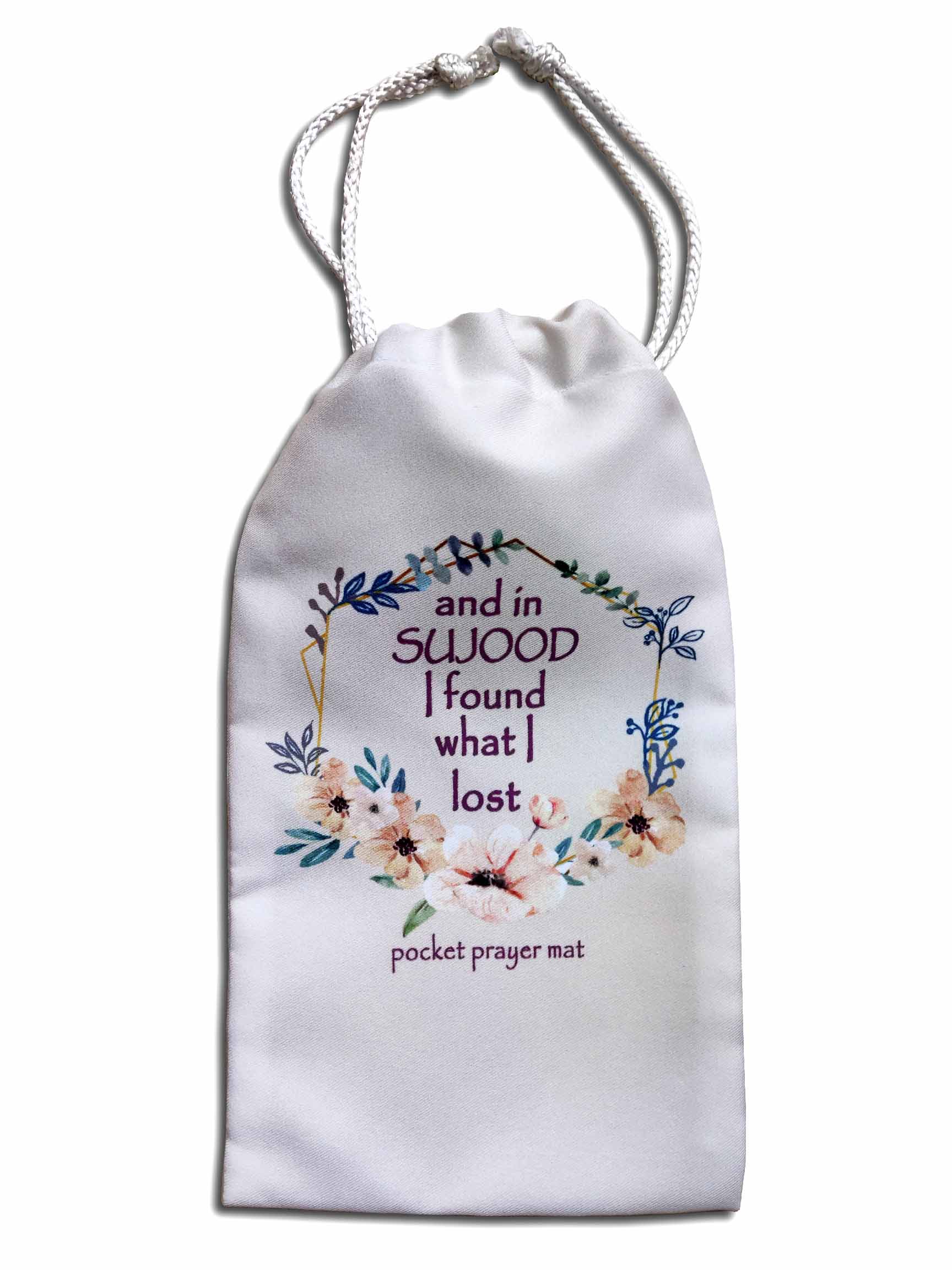 Pocket prayer mat - Your beautiful companion for prayer on the go! These are light weight, soft and foldable, designed to be carried anywhere and everywhere with you. Available in a gorgeous pattern digitally printed on twill fabric, it also comes in a coordinating drawstring pouch making it easy to carry or fit into any bag.