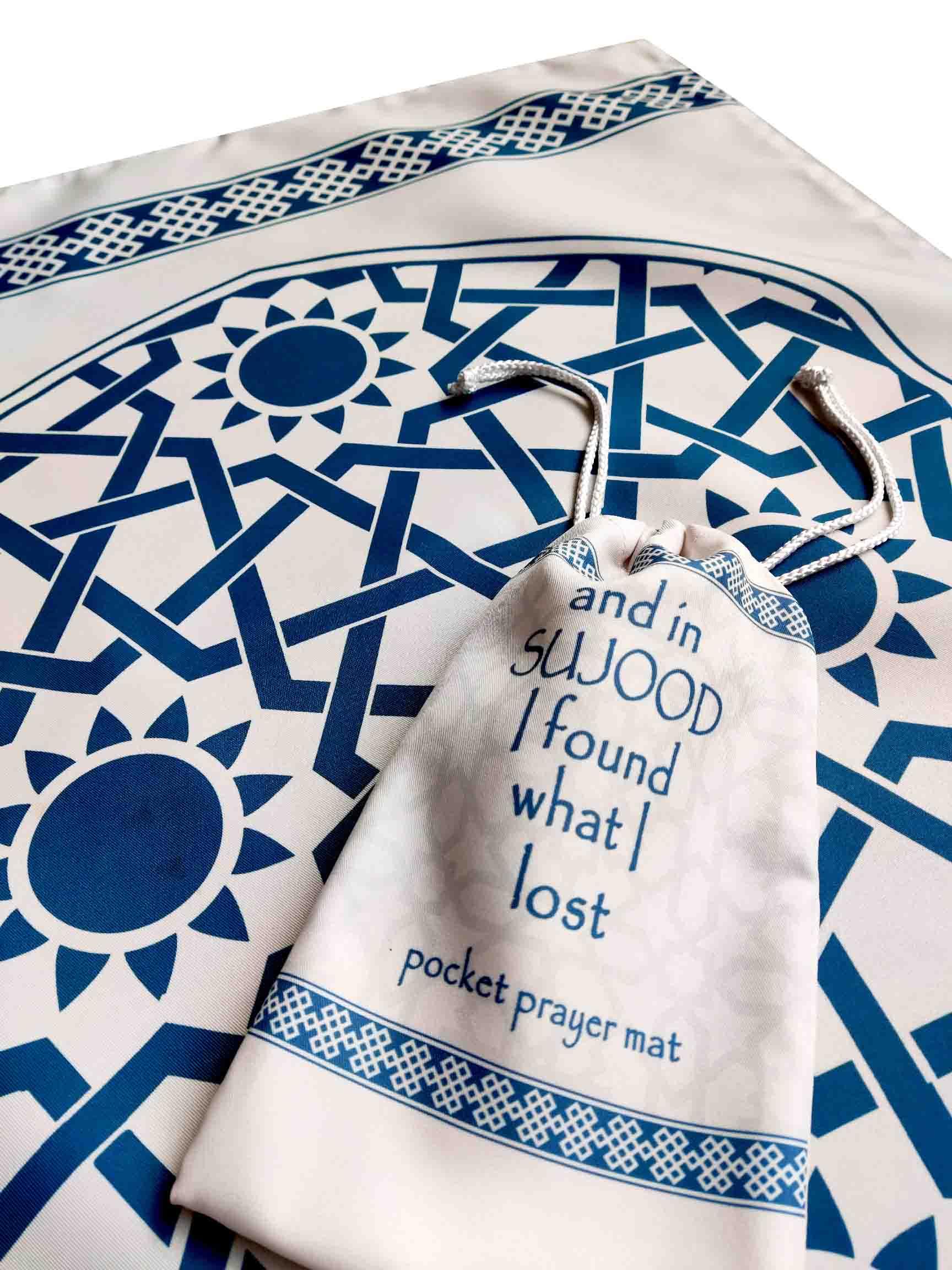 Pocket prayer mat - Your beautiful companion for prayer on the go! These are light weight, soft and foldable, designed to be carried anywhere and everywhere with you. Available in a gorgeous pattern digitally printed on twill fabric, it also comes in a coordinating drawstring pouch making it easy to carry or fit into any bag.