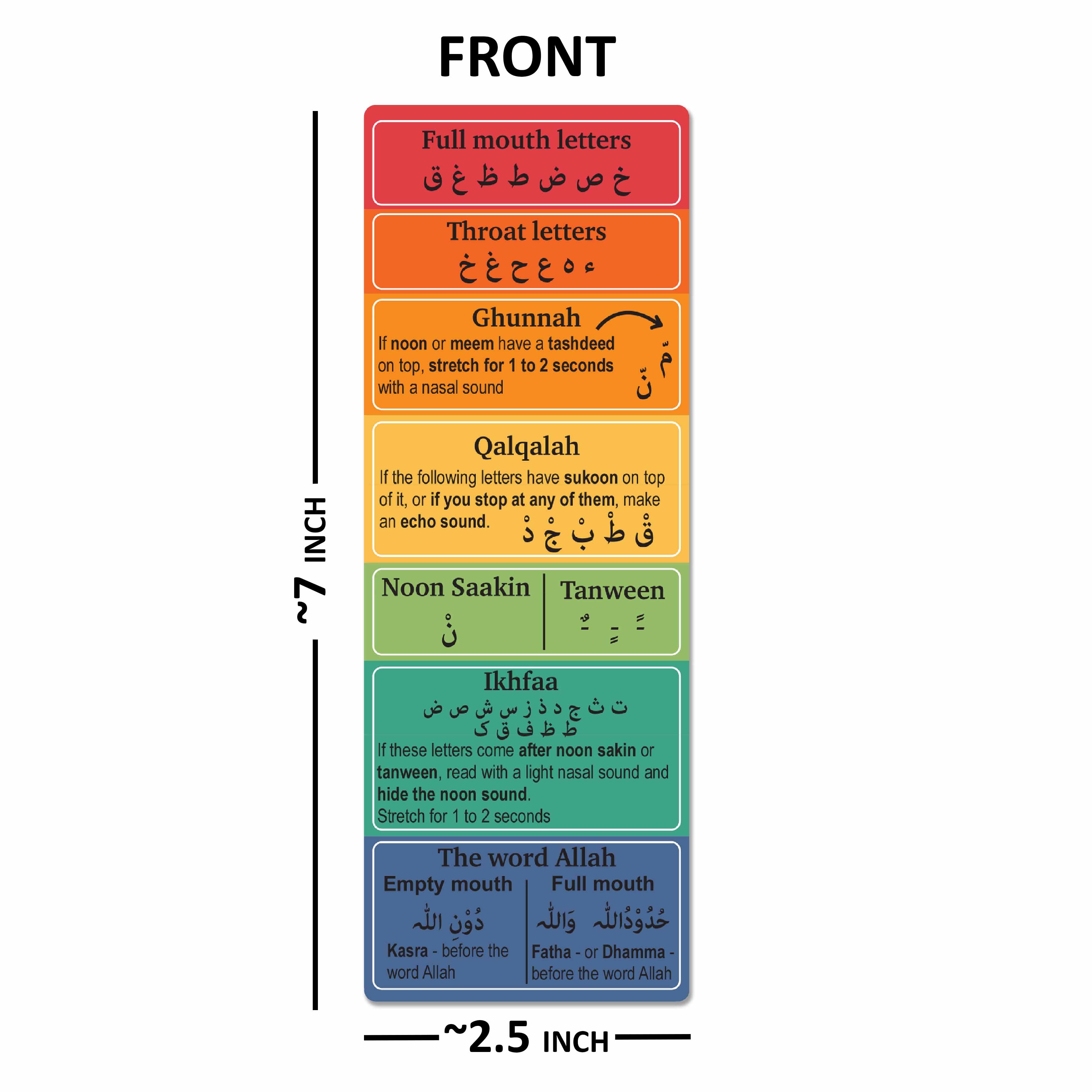 Enhance your Quran recitation with our Tajweed Bookmarks, designed to help you remember key tajweed rules while marking your place. These vibrant, high-quality bookmarks feature essential tajweed guidelines in a clear, easy-to-read format, making them perfect for students, teachers, and anyone looking to improve their recitation.
